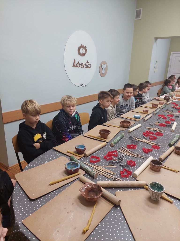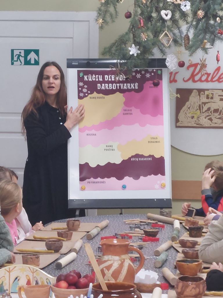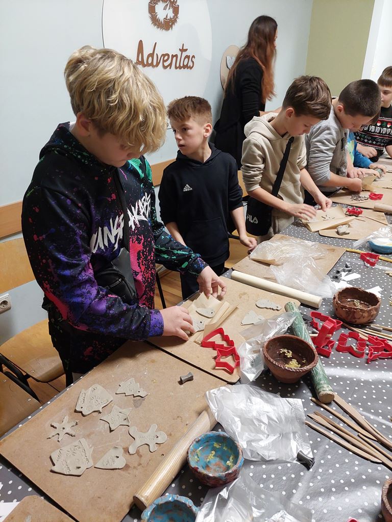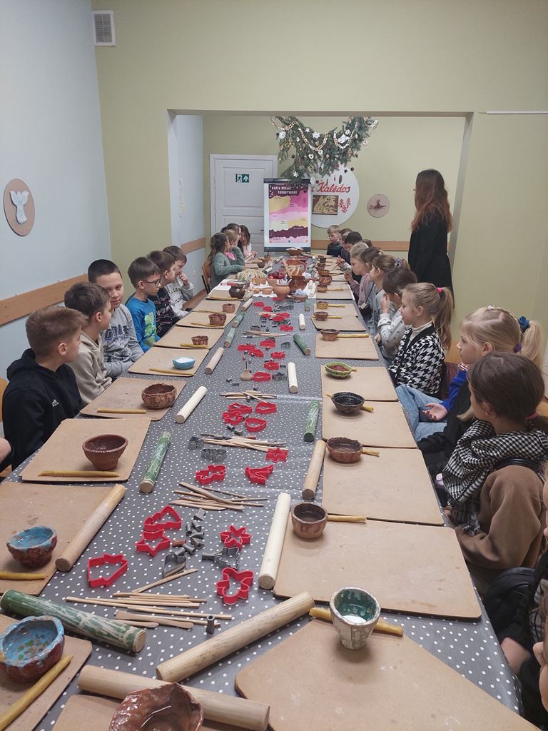Užsiėmimo pabaigoje laukė kūrybinės dirbtuvės: iš baltojo molio vaikai gamino kalėdinius eglutės žaisliukus, dekoravo juos raštais ir simboliais. Kiekvienas dirbinys tapo ne tik puošmena, bet ir mažyčiu prisiminimu apie senąsias mūsų krašto tradicijas.