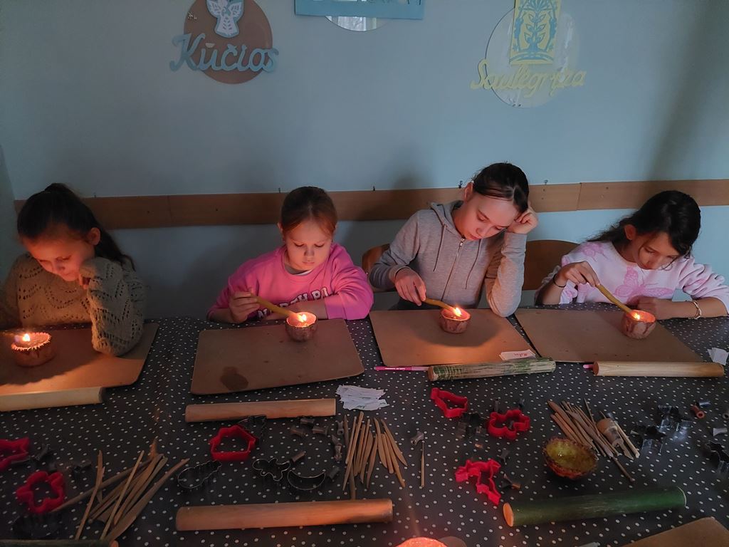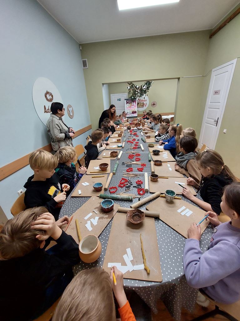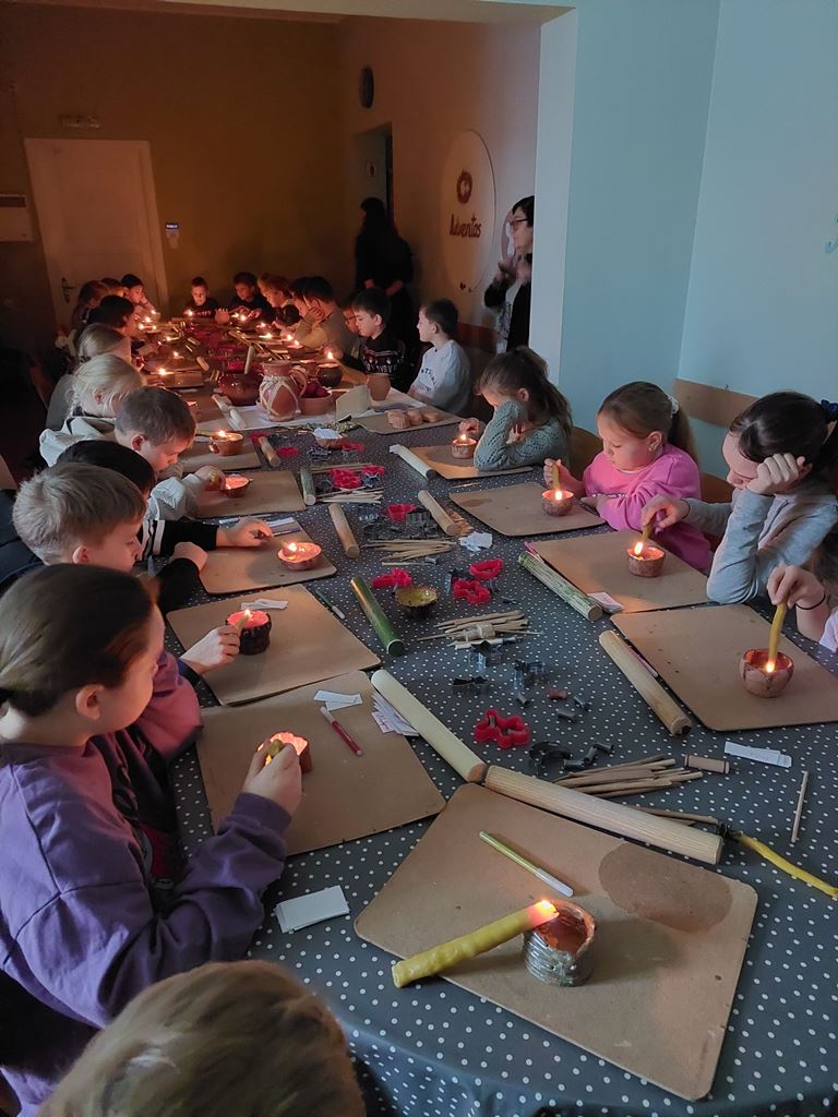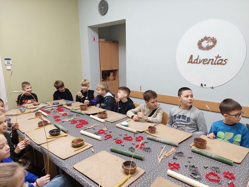 Užsiėmimo pabaigoje laukė kūrybinės dirbtuvės: iš baltojo molio vaikai gamino kalėdinius eglutės žaisliukus, dekoravo juos raštais ir simboliais. Kiekvienas dirbinys tapo ne tik puošmena, bet ir mažyčiu prisiminimu apie senąsias mūsų krašto tradicijas.