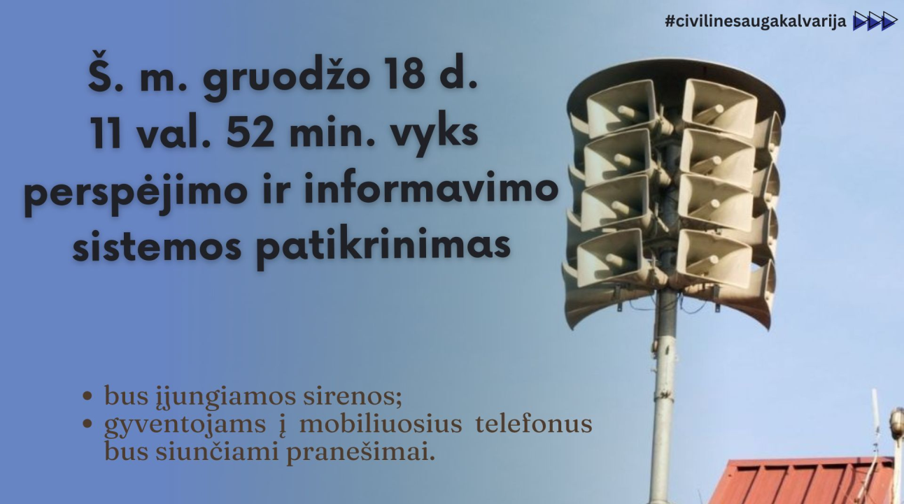 2025 m. gruodžio 18 d. (ketvirtadienį) nuo 11.52 val. Lietuvoje bus tikrinama Gyventojų perspėjimo ir informavimo sistema – šalyje kauks sirenos. Patikrinimo metu sirenos kauks 3 minutes (nuo 11.52 iki 11.55 […]